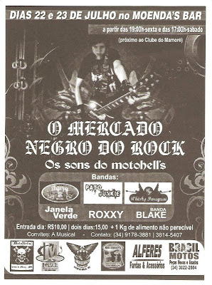 - 22 e 23 e julho, Mercado Negro do Rock no Moenda's Bar, 10$ por dia ou 15$ pros dois dias com as bandas : Zharpa, Pato Junkie, Whisk Paraguai, Janela Verde, Roxxy e Blake